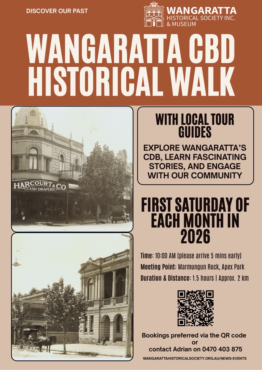 Join our knowledgeable local guide, for a fascinating 1.5 hour walking tour of Wangaratta’s CBD, exploring the city through a historical lens. Discover what once stood where, and hear stories of the people and places that shaped Wangaratta’s past.